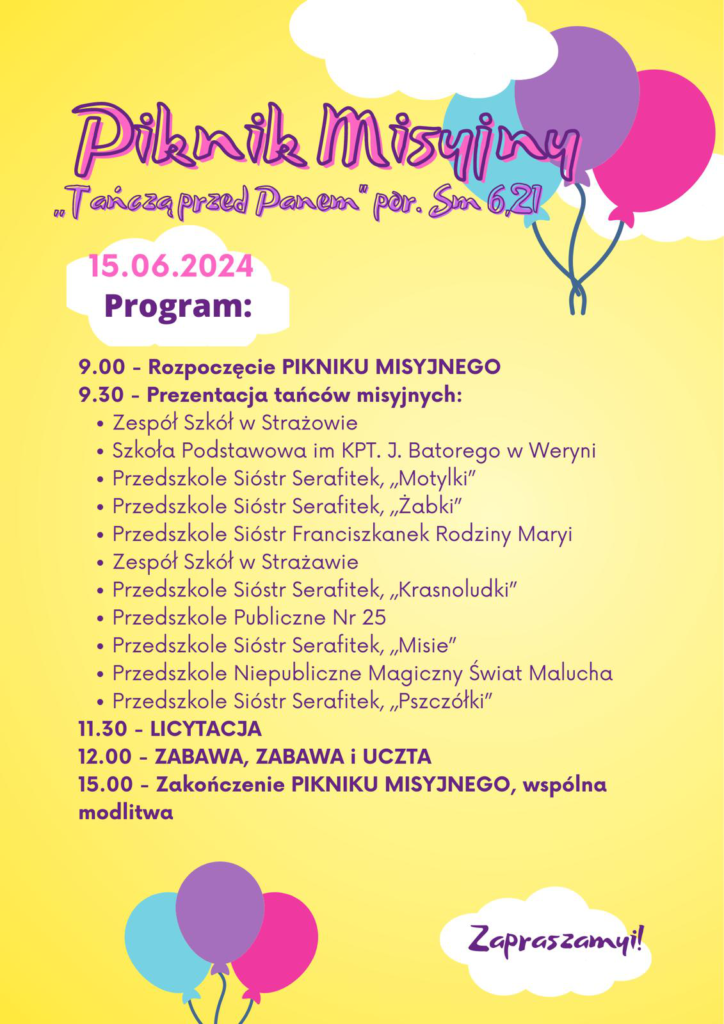 Wszystkich sympatyków misji, a szczególnie przedszkolaków zapraszamy na Piknik Misyjny do Sióstr Serafitek w Rzeszowie na ulicy Łukasiewicza.